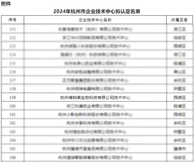近日,杭州市经济和信息化局(杭州市数字经济局)公布了2024年杭州市企业技术中心拟认定名单,杭州唯铂莱生物科技有限公司技术中心荣誉入选。